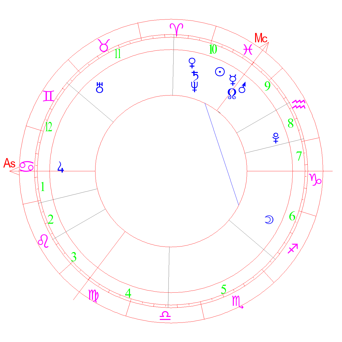 The degree of astrologists. Individualism, travel, lots of anxiety, life being a strugle, danger of dying unexpectedly, especially at night. May bring about homosexuality (ASA). Disputes, anxiety, injury, typhus. The degree of Saturn (Kefer)