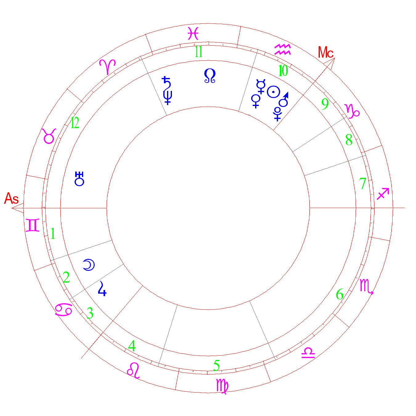 The degree of falseness. With positive cosmogram in general can bring about creative enthusiasm, intensiveness, brightness and irregularity. With strong filled signs of Gemini, Aquarius, Aries, brings about poverty. [-] premature death, danger to hands and feet (ASA). Danger of freezing, collapse, strong personality, sense of reform. The degree of Mars (Kefer). Performers; chairs (deVore)