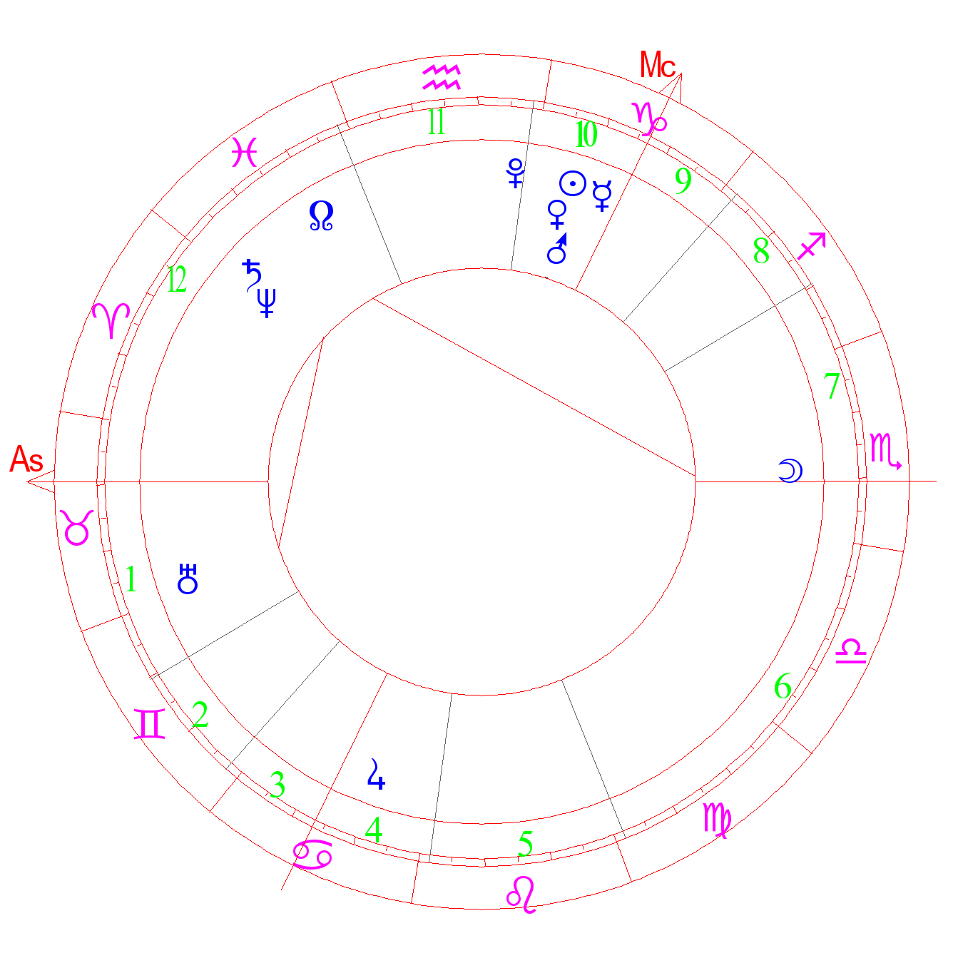 A heavy degree, taxing one’s powers. Suicide. A boring life, perpetual preoccupation, bearing the Cross, no moment of free time. Complaints, whining, lack of power. The situation is difficult to achieve using one’s own efforts. With strong air elements and signs of the movable cross- there is a tendency to theft, deception, fraud, kleptomania (ASA). Diligence, continuity, perseverance, success on one’s own, ability to paint, medicine and agriculture. The degree of Saturn (Kefer). Degree of erudition (deVore)